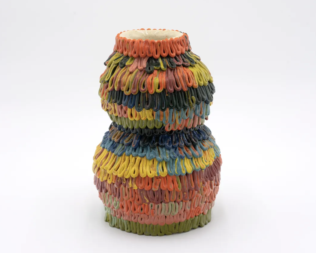 Shaggy Pot by Corinna Cowles Materials Handbuilt with dyed stoneware strings. Glazed clear. Size 10" x 8" x 8"